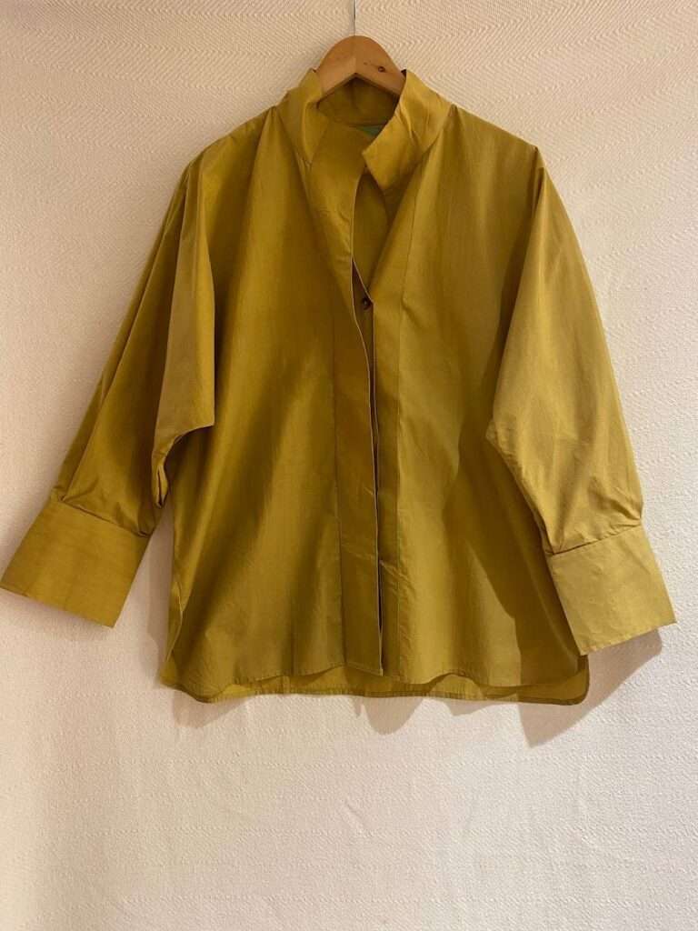 Esta camisa esta siendo un súper éxito desde que la hemos puesto en las tiendas . El detalles de la manga con un puño muy ancho y consistente le da personalidad . El cuello Mao tambien ancho y subido combinado con una manga ligeramente murciélago le dan fuerza y la convierten en una camisa con un toque de chaqueta que queda muy bien abierta y es perfecta para primavera donde nos encanta llevar prendas que tengan consistenci
