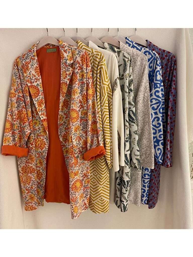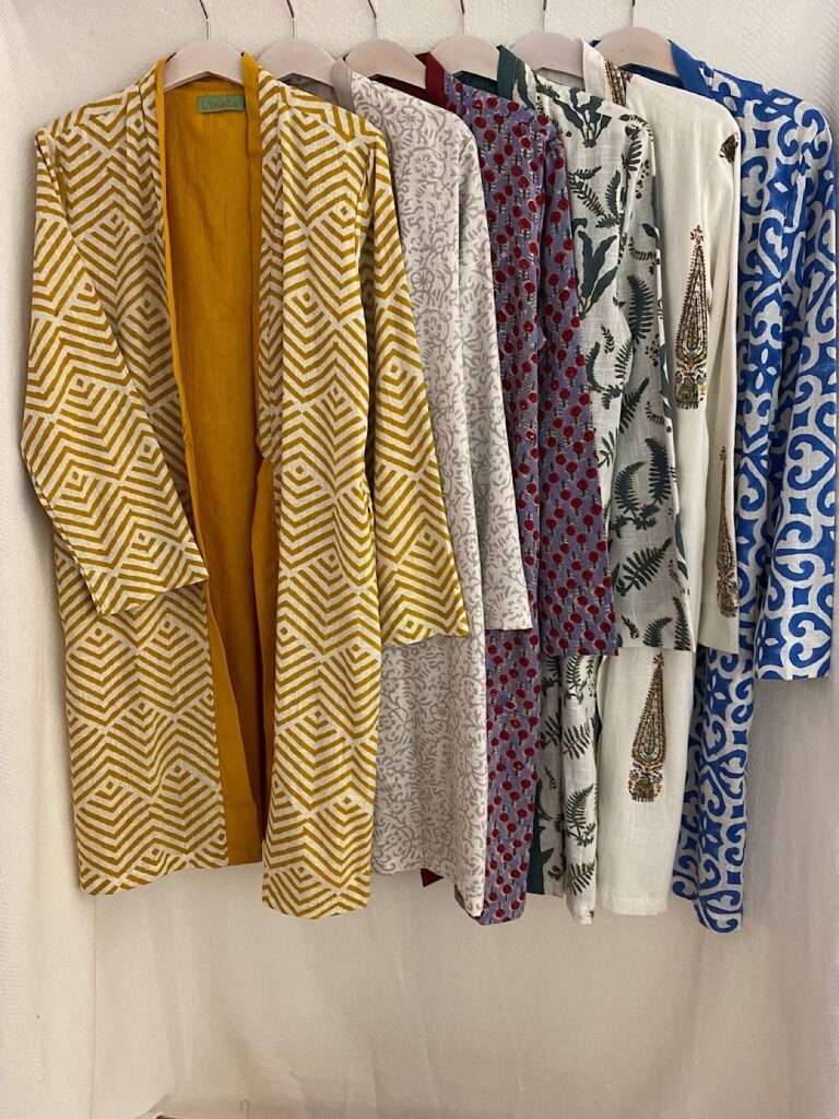 Son 100 % de un algodón con textura, con forro también de algodón y preciosos estampados blockprint , así podemos sentir su tacto natural y su estampado manual tan especial ,diseñados para nuestras tiendas , exclusivos para vosotras