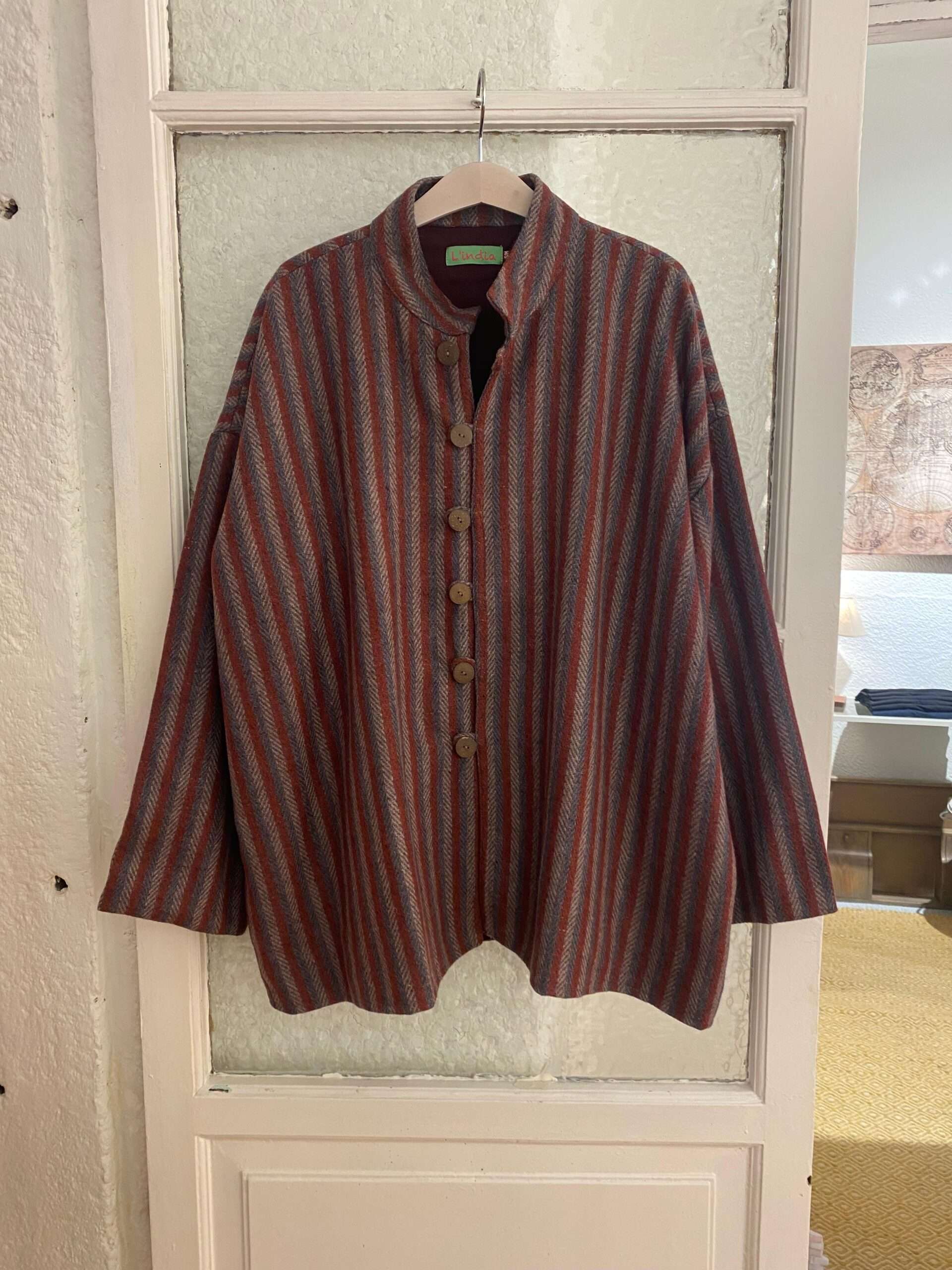 Prenda muy especial con un corte oversize entre abrigo y capa. Cuello mao y botones en madera.