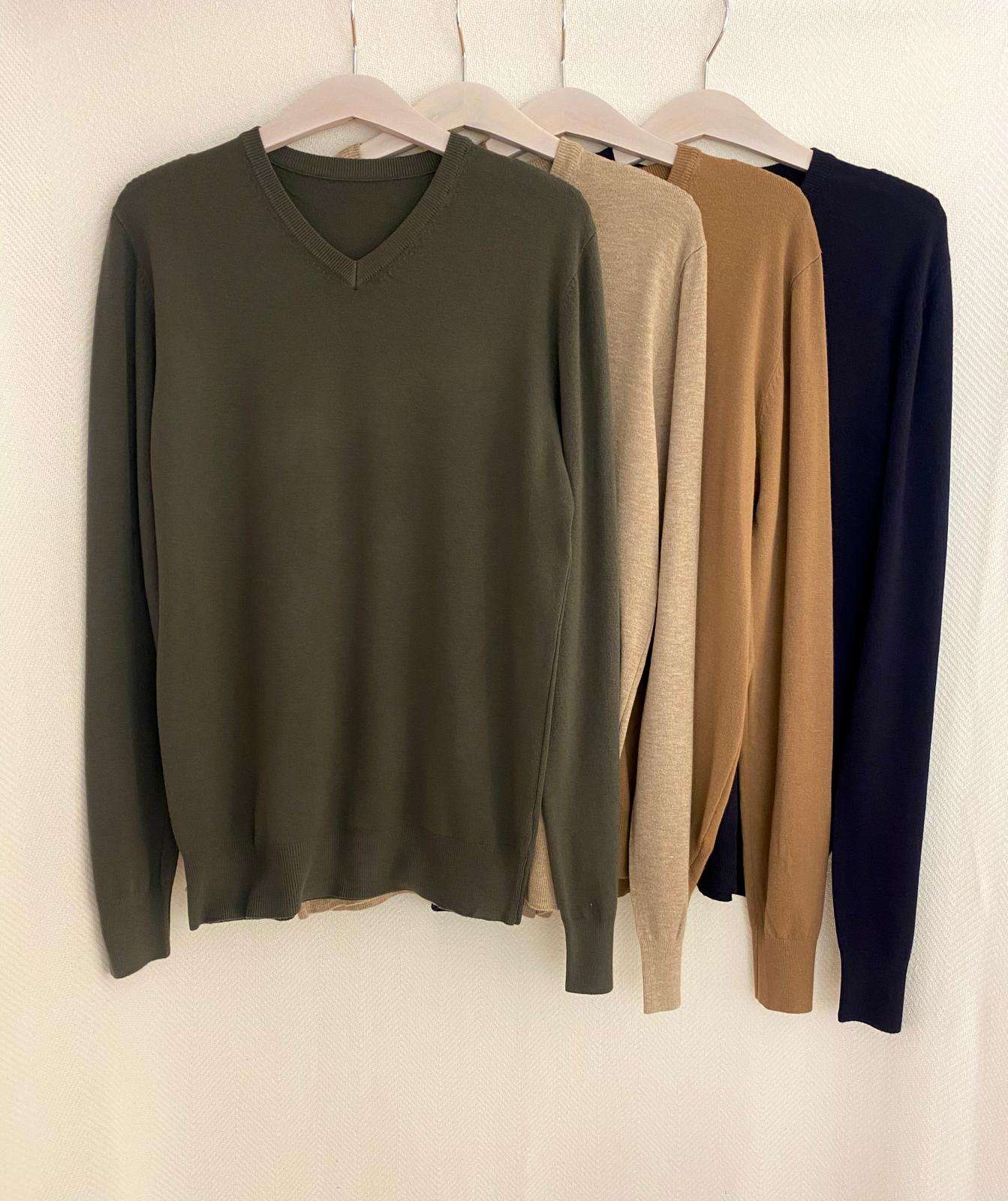 Jersey punto fino con cuello en pico. Tacto suave y agradable. Disponible en cuatro colores.