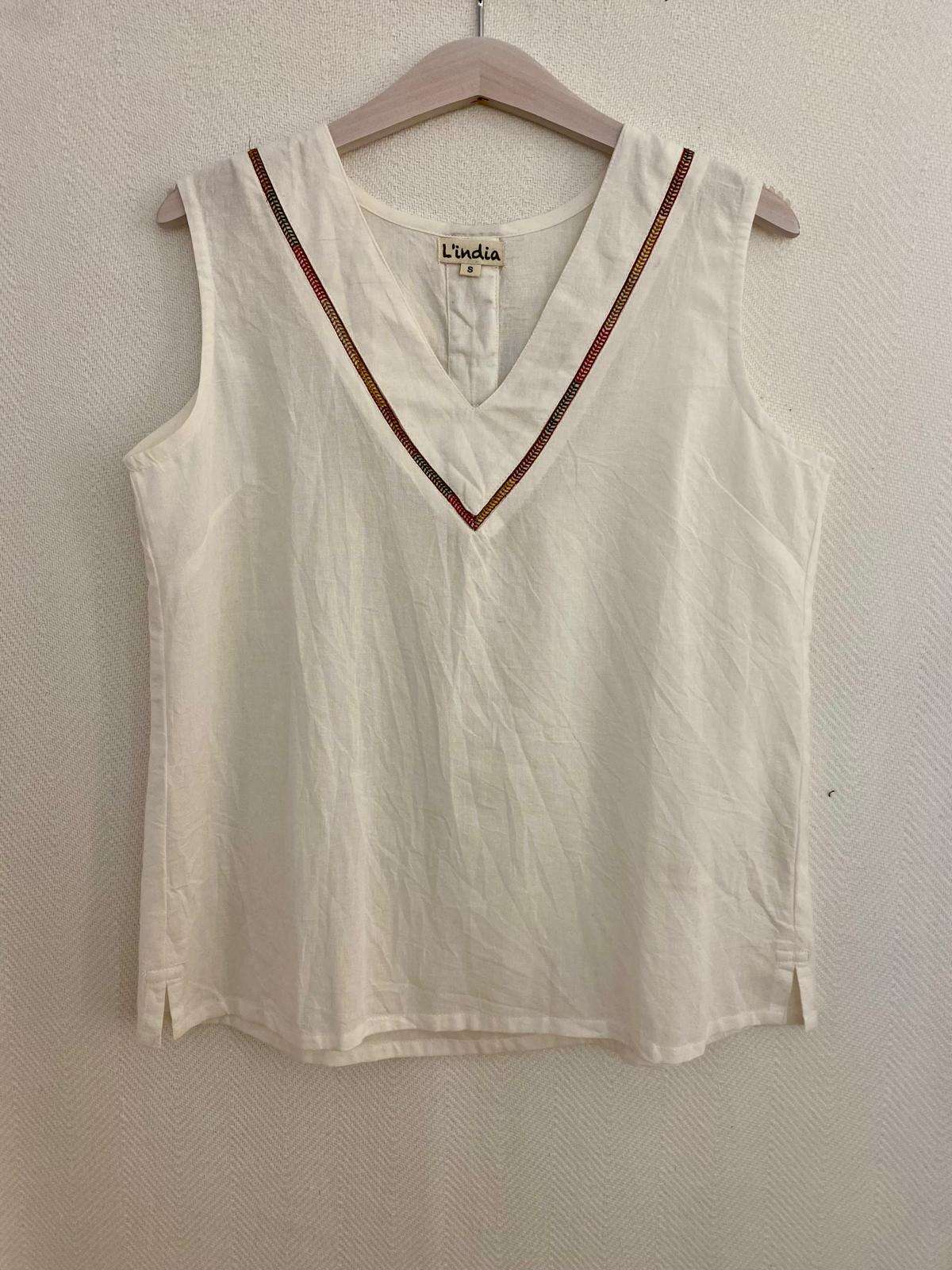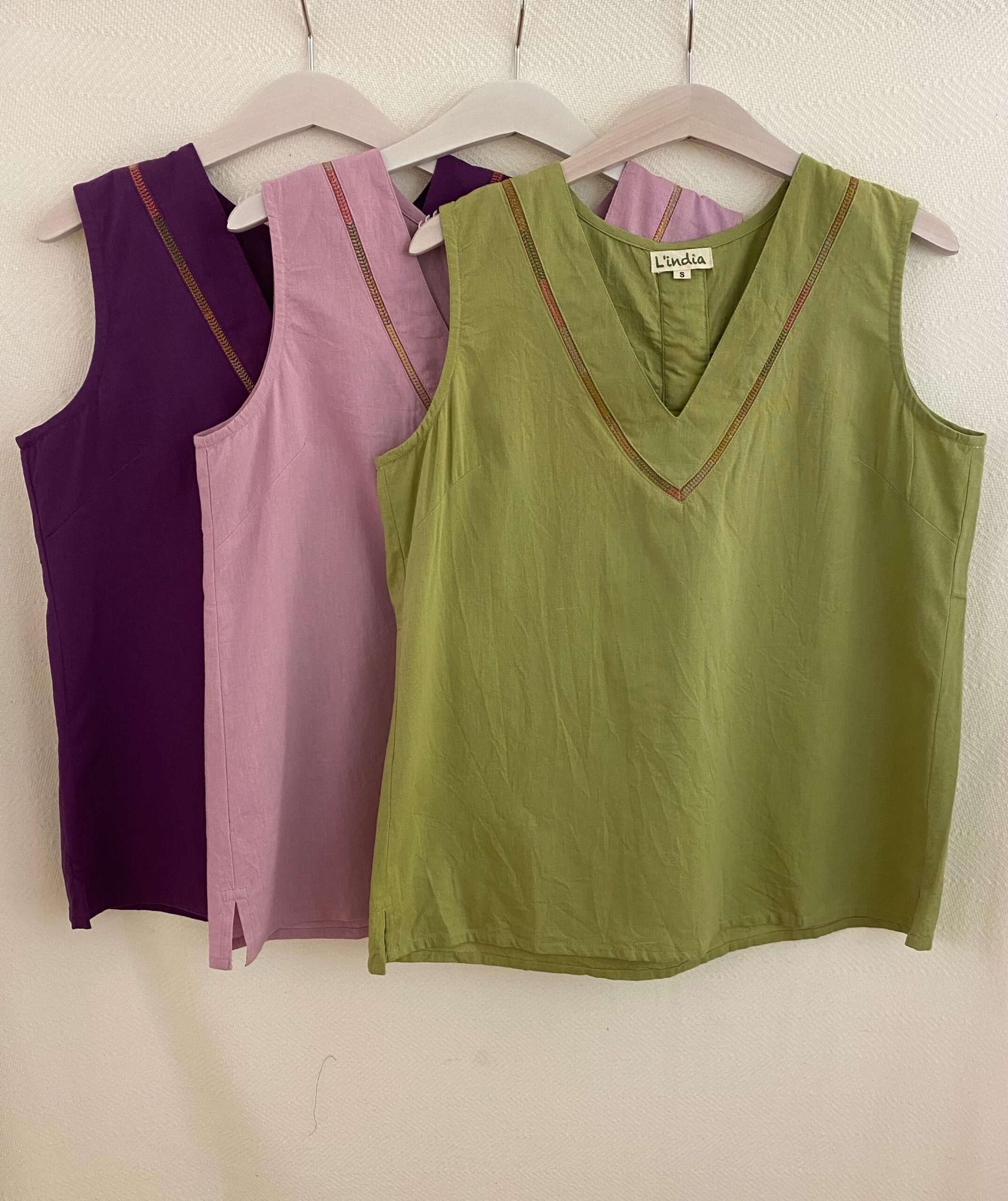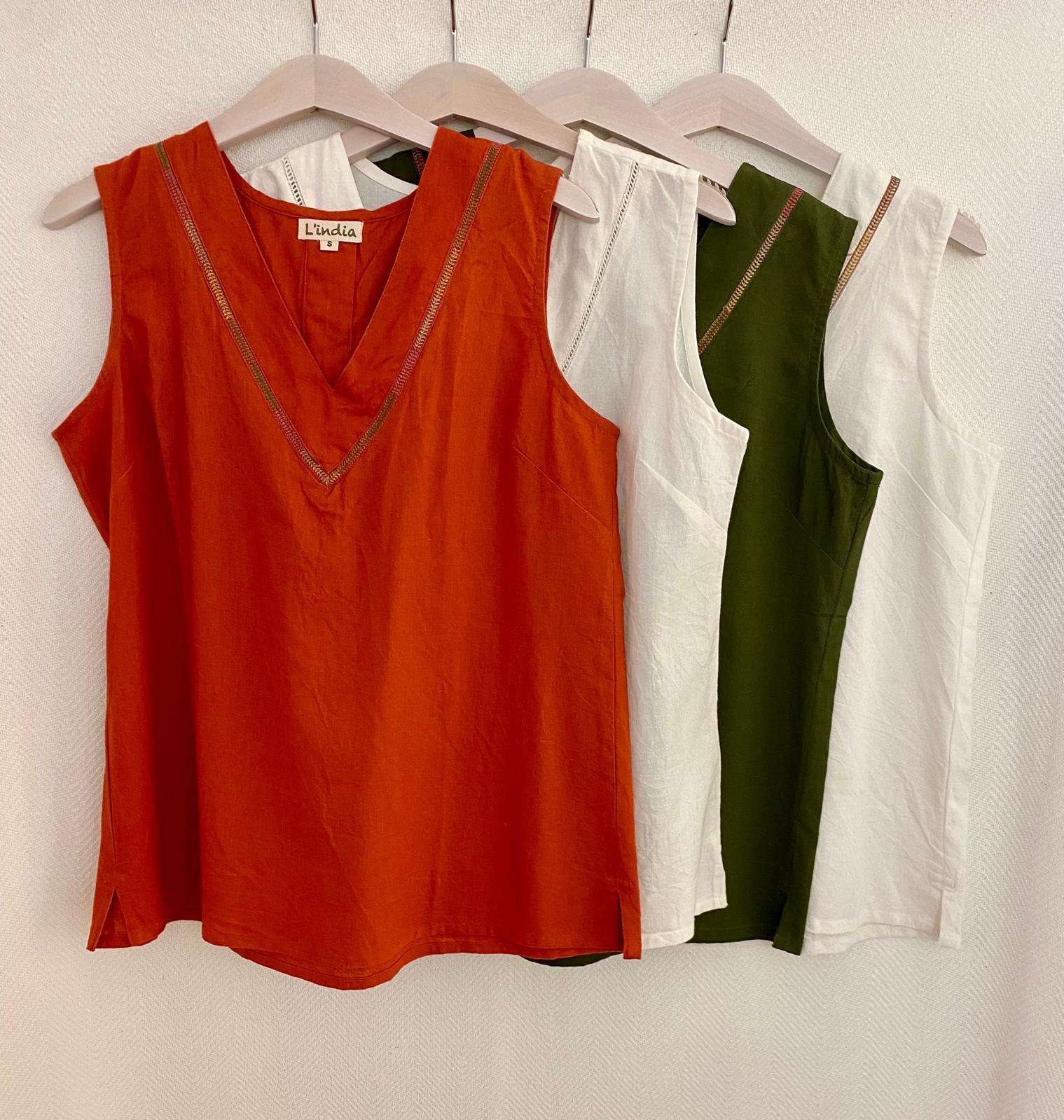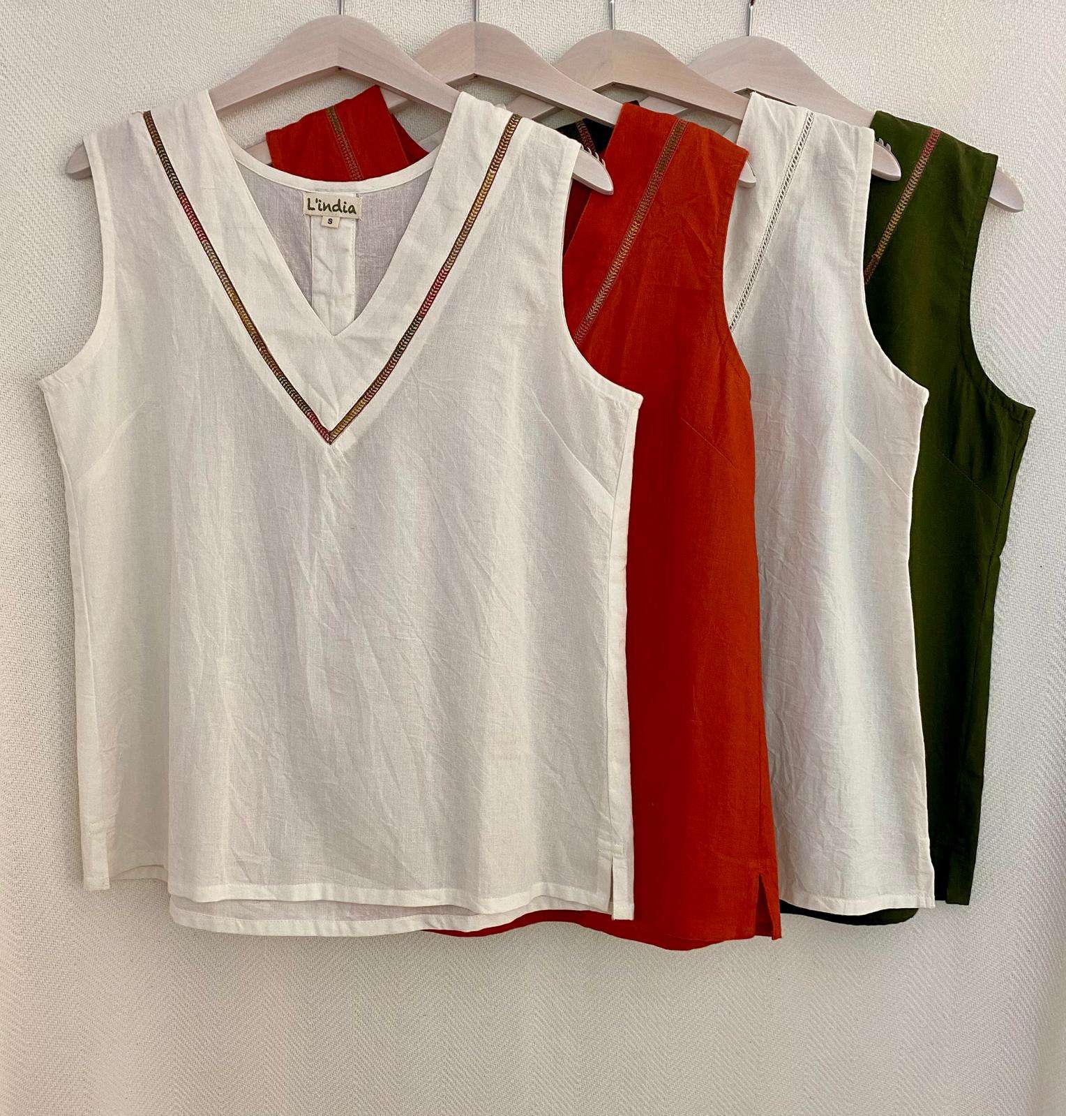 Top sisas cuello pico con detalle bordado en el cuello. Disponible en tres colores muy combinables.